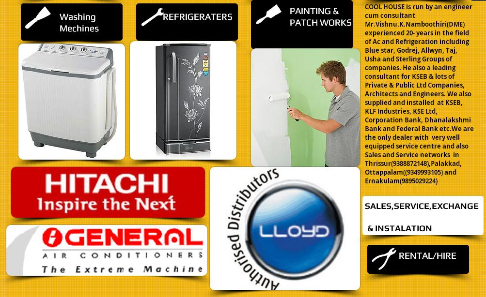 COOL HOUSE is an exclusive authorized distributor cum sales and service dealer and Authorized service center for BLUESTAR, HITACHI, DAIKIN, O GENARAL, ONIDA , LLOYD,ETA GENARAL VESTAR, SHARP-Air conditioners, USHA, BLUESTAR, VESTAR & AQUANEETA  Water Coolers, Deep Freezers, Water Dispensers,Chillers,Display Units, Water Purifiers, Milk Coolers and V-GUARD, ZEEON, Stabilizers,UPS and Inverters.