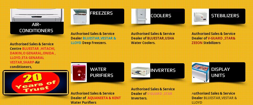 BLUESTAR, HITACHI, DAIKIN, O GENARAL, ONIDA , LLOYD,ETA GENARAL VESTAR, SHARP, USHA, BLUESTAR, VESTAR & AQUANEETA V-GUARD, ZEEON Etc..